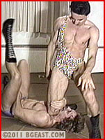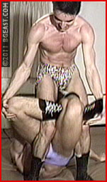 As Kid Leopard sat, perched coolly in his corner, Bryan entered the mat area and admitted that he "never thought it would come to this." Leopard, on the other hand, said he "always knew it would come to this - and I've been looking forward to it." Dissent between the two is reported to have begun when both were "involved" with Uli Dirksen, the German beauty who appeared in many BG photosets and in "Kid Leopard in Europe." The exact details of this triangle are lost, but it set up this encounter between these two long-time friends and tag team partners. As you might expect, this bout features some phenomenal action, high-flying moves and spectacular holds between two of the most skilled wrestlers ever to grace our screens: Bryan outweighs, outreaches and outmuscles Kid Leopard so makes Leopard suffer like few men ever have, utilizing his advantages to punishing effect. Though Leopard has met and munched his way through many a big boy, he's never had to face one who knew him so well! Bryan makes full use of this inside track. If you've been waiting to see Kid Leopard get a taste for his own medicine, here it is! Bryan beats Leopard at his own game, locking him in some of the Leopard's very favorite pet finishers - making him submit to them himself! The Kid gets trapped up in the double-shoulder backbreaker and it's an incredible turn-on to see and hear him being forced to cry out in defeat.