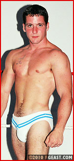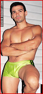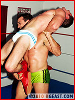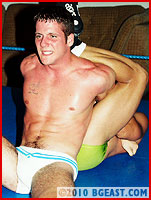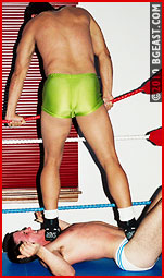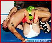 Young rookie Brad is a lightweight phenom, tightly sculpted with a very full pouch! Especially as he sports it in these white bikini cut trunks. Brad's butt is ready to pop right out of his white bikini! Cruze, one of the early lightweight masters of BGEast-style heeling, is more than chomping at the bit to destroy this little muscleplug cutie and see him suffer. The hispanic hunk-star looks especially hot here in his butt-hugging green squarecut that lets his package have maximum freedom.