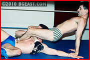 Evenly matched, and both willing to try high-flying moves, these muscled lightweights explore the BG East ring with back and forth action. Dick the "prick" earns his nickname by refusing to release his mean holds after Todd submits. So Todd holds his submissions long & hard too, as the aggression intensifies. We get hot close-ups of both their bulging trunks as they grapple it out using muscle flexing scissors, mean chokes, screaming crotch-splits & more in this multiple submission lightweight punishfest. Here is a great pretty boy babyface vs cocky punk heel bout!
