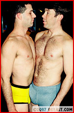 Hairy chested Bill has the hots for nasty Dick, but he wants to teach the cocky mouthy punk a lesson too. Wrestling in jeans, tight squarecuts, then nude and hard: double hammerlock, a screaming crotch split double submission, humiliating slaps, spanks, crotch to face pins, humping, and ball-grabs in this all-out X-fight. Bill can't hide his excitement as Dick sucks his tit before applying a mean nelson/scissors and reaching in those trunks! Great closeups of butts'n'bulges. Bill moans with reluctant excitement as Dick forces kisses, tit-twisting, mean submissions. Dick rides his rod over Bill's hairy chest, big balls & humpy butt! They can resist no longer: both dicks explode load for load in mean matmen mayhem! HOT!!!