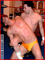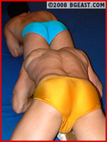 If Mr Joshua thought he was gonna roll over Chico, he was very soon disabused of that fantasy! Chico may be a rookie but he's got a nasty mean streak and doesn't hesitate to reveal it. A rolling headscissors presses his advantage, especially when cheating Chico grabs the ropes for leverage. But that only pisses the bigger man off. Muscle matters as Joshua powers out and applies a overlapping toe hold/camel combo that forces a quick submission. A surfboard, scoop slams, and it's Joshua's turn to exact some turnbuckle revenge, pummeling the rookie's gut before grinding a boot into his throat, Mr. J's trunks gaping visibly with the strain of containing his oversized assets. Ah, it's the not so little things that make life worth living!