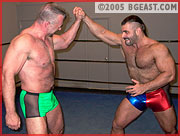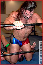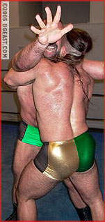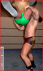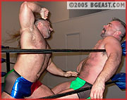 Largo thinks he has the measure of his man now and challenges Gunz to a test of strength. Shockingly, Gunz is quickly brought to his knees, unable to withstand the physical force of his opponent. Gunz slowly gets back on his feet, and evens up the odds with a swift kick to the bigger man's balls! Largo is stunned, leaving him wide open to a double pec claw from Gunz. Cornering his big man, Gunz delivers thunderous forearm smashes to Leo's huge chest, the sounds of the impacts echoing throughout the building. A reversal and now Gunz is on the receiving end of a series of pulverizing blows to HIS big chest! Shot off the ropes, Leo lifts Gunz into a bone-crunching bearhug, then slammed back down on the mat! Gunz can barely catch a breath as he is slammed, bearhugged and slammed again. Never have we seen this big man's man beaten so mercilessly. Gunz, not one to give up so easily, slowly gets back on his feet, only to get caught from behind in a reverse bearhug! Our poor Powergunz is put on pitiful display, his face contorted in agony. Another bearhug and Powergunz is left broken on the mat, conquered by this newest and beefiest of bruisers on the BG East roster. Whew!