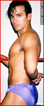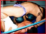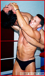 Cocky Cruze faces our brutal ultraheel with Max's brutality countering Cruze's acrobatic streetfighting. Mutual torture: Max's effective use of the claw is a direct result of his tag-teaming with claw-master Jose. Cruze's use of painful armlocks is fearsome and Mad Max is no exception in succumbing to their humbling effect. Cruze forces Max to utter several humiliating versions of "I give." "You're such a pussy you turn me on. Look at this!" Cruze says as he shows off his swollen rod. They struggle for total domination as their trunks get stripped off and number of surprise moves leads to a very hot finish. More than enough action, and arousal, for many viewings.