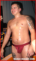 The finale of this tournament brings a new level of intensity to oil wrestling, as these two know few sexual inhibitions and are eager to please the crowds, and each other, as they vie for top dog position. Balls and butts get slapped as the oil flies. Groins get grabbed, in and out of skimpy, oily jocks! But will Freddy finally turn the tables on his boyfriend and force him to a JO finale as this tournament promised, or will Ash's knowledge of Freddy's turn-ons and tolerance (and excitement) for ball-smashing torture lead to crowd screaming its approval to a well lubed jerk off show? The spoiler might have slipped out from some audience club member but you'll want to enjoy every minute of this sexiest of oil showdowns! THANKS again to the Leather and Lace Club organizers for letting us into their private club action!