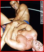 Hot-bodied Jeff is hot to avenge an earlier defeat to our Latino heartthrob. "Revenge is sweet", taunts the Canadian as he flexes in post-submission victory after they roll for the first fall. But victory is short-lived as ball-grabbing and a vicious camel clutch leave the Canadian muscleboy begging for mercy. Full nelsons, face-sitting, ab punching, leg-splitting, trunk-pulling, head-butting and LOTS of ball torture take this rule-bending match to its surprising finish!