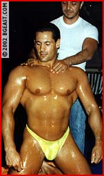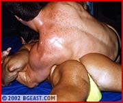 Make sure you save some for this next match 'cause we've saved the best for last. Dante was a rookie but one with pro aspirations and like many rookies, he thinks he can challenge and even take the vet. And he gives Psycho a run for the money to the point where our star pro has to get pretty rough. Phenomenal muscle on display, and a wide range of both skillfull and overtly rough action from both fighters. Hot submissions and big beef on display. Dante is big, bad and beautiful. Just ask our Joey Pappaluca who served as the adoring manager who oiled him up. HOT!!!