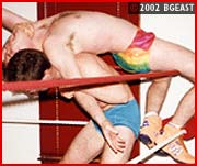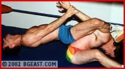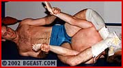 Dick's longheld fantasy: taking on the lightweight champ TNT! High flying acrobatics including a flying body scissors make this a dramatic pro punk battle. Dick clamps on a leg nelson/arm crank that has the champ screaming. TNT's payback: upside down bearhugs, a shoulder breaker, chicken wing: two great wrestlers using maximum torturelocks. Dick looks hot stretched out in multiple screaming submissions, or applying his own torture locks to the shocked champ. Ball-busting, rope chokes, stomach claws, figure 4's, crab: mucho invention and creativity! The world's best wrestlers do it at BG EAST!