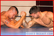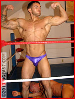 Posing alone doesn't cut it at BG East. If you want to win, you usually need to stalk your man like a predator. Braden doesn't give Chace much time to learn this lesson, but Chace is a fast study. Later in the bout, in a chest-to-chest test of strength, Chace once again overpowers his iron-solid opponent, but having learned from experience, he now also kicks the man in the midsection, just to guarantee his hold on victory.