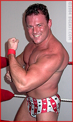 This is a match that would light up any indie arena. Tim is a classic pro - a big muscle hunk in perfect hip-hugging trunks. Emboldened by a string of impressive victories, Bulldog attack the rookie before the bell, mashing him into the turnbuckle. "I'm gonna make short work of you, you piece of shit!" Three over the knee backbreakers, a side suplex and the massive Bulldog flying elbows set up the new guy for a first fall rack submission. "Pathetic rookie!", Bulldog snarls. Shooting for a quick finish so he can "go have a beer", Barzini clamps on his brutal Bulldog bearhug. Tim goes limp but refuses to submit. Bulldog then tries to break his ribs with a reverse bearhug from behind. And yet the rookie hangs in there. A 3rd bearhug promises to be the charm but Tim slides his arms in and under Bulldog's and reverses! Bulldog gets his butt tossed all over the ring. Foaming at the mouth, determined not ot be outdone by a first-timer, the rabid Bulldog gets down and dirty...