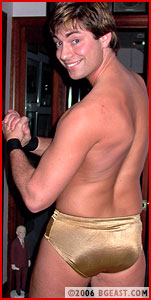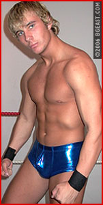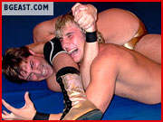Caleb Brand has a classic boy-next-door look, with his blond good looks and muscled body - definitely a star on the rise. But lurking behind that cute Canadian good-guy look is a tough-as-nails fighter who resorts to anything required to come out on top. French-Canadian Jean Benoit trains hard and is looking to make a move on his way to the top, both on the indy circuit and in the BG ranks. And a victory over Caleb would set him well on his way. The smack talk flies back and forth when Benoit gets to the ring - which young man has the skill and drive to back up his words of aggression remains to be seen. But once the action starts, its fast and furious. The speed and finesse these two young men show is impressive - as well as their determination not to lose to the other. The holds and moves are spectacular - and their training and tenacity shows with very move. They both have great ring instincts - and the ability to not only dish out punishing moves, but to take it as well. Each slip up, each opening is seized by the other as they methodically weaken each other; Caleb going for Benoit's back, Benoit going for Caleb's neck. It's calculated and deliberate - choosing a body part and working and weakening it until the opportunity presents itself and a submission is the inevitable result. And just when it looks like Caleb is about to grab the first fall following some spectacular back punishment, Benoit takes advantage of his overconfidence and slaps on a brutal submission hold that has Caleb screaming out his submission! First fall to babyface Benoit! But this match is far from over - no matter how dire it might look for Caleb.
