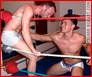 With his spectacularly brutal BGEast abs bashings by Kid Vicious and Brad Rochelle, a slew of YouTube videos and countless gleeful poundings on the underground circuit, Steven is a new-age internet icon: a human punching bag widely admired and desired for his unmatched ability to take a body beating. He displays his infamous abs with a series of sit-ups. Sexy Alexi is an icon of another stripe. While names like Wade Cutler, Justin Pierce and (for a time) Brad Rochelle learned that the rare combination of stunning good looks and the ability to take a beating guarantees a large fan following and an ever-eager phalanx of sadistic challengers hungry to step into the ring and work them over, Alexi's never quite embraced his role as BGE's resident prettyboy punching bag. He slips into the arena, leapfrogs over the ropes and introduces himself by driving his big, bare, size-13 foot right into Steven's bread basket mid-crunch with a sharp smack followed by the even louder thunk of his foot slamming into Steven's downturned gut with enough force to flip him over. 'Get up!' Alexi commands, his deep voice thick with menace. As often as we've seen him groveling on the mat, it's easy to forget how big Alexi really is. But as he roughly drags Steven to his feet, shoots him into the ropes, and drives his point home with a fist to the gut makes has the human punching bag somersault in midair before crashing to the mat, his stats scream volumes: 6 foot, 3 inches, 220 lbs. of muscle dead set on dishing out a beating to make the fans forget the many times he's been the one on the receiving end. And as Alexi repeatedly steps and stands on that rippling, reddening gut, Steven's breathless gasps and grunts leave no doubt he's feeling every ounce'