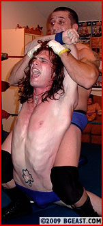 His long hair hanging down, Lanny howls in agony as Rico punishes him in his shoulder-wrenching back