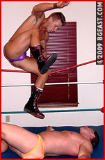 Bodybuilder Braden's bulking up for another round of physique competitions. He saunters into the ring in a too-small posing suit more approriate for an on-stage flex off than a wrestling match and checks himself out, his barrel chest and big arms overflowing the mirror. Love him or hate him, Aryx is always full of surprises. His leather jacket and skin-tight singlet is unexpected, but his immediate arrogance and mouthy insults are trademark Quinn. "Just because you get a few Chinese letters on your arm like me doesn't make you a legitimate badass," Aryx taunts, mocking Braden's tats. Call it hook, line and sinker: Aryx's pre-match cracks are a set up, and Braden takes the bait, flexing his bigger bod, all that raw muscle wide open for a cheating running forearm. But... even as the smack of skin on skin echoes, it's Aryx looking on in shock as Braden doesn't move, doesn't even flinch. A retaliatory clothesline sends the hunky punk flying. Singlet-clad, Aryx obviously intends rely on his alleged amateur skills versus Braden's brawn, but it's hard to grapple when a collar 'n elbow lock up results in two huge tosses across the ring.