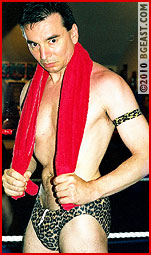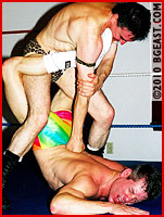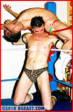 Some guys think they are impervious to pain and pride themselves on taking whatever their opponents dish out - and yet still not submit. Midwestern muscleboy Ken Decker is one. For his BGE debut he shot for the max: "Give me that ball-less Bodywrecker" he wrote, "or that washed-up weasel Kid Leopard". Nowadays it takes alot to lure the Leopard back before the cameras - a humpy Parisian with abs begging to be bashed - and a hunky rookie with a high threshold for punishment did the trick back in 2000.
