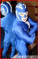 Next we see the unidentified agent, face obscured from our view, donning the gear and assuming the identity of fabled BG East masked wrestler Blue Lightning, a figure steeped in mystery, legend, and just perhaps, if you believe such things, magical power. He has haunted the BGE ring before in the Superhero Heel series, bringing doom to golden boy Troy Baker and facing his own at the hands of the sinister Black Spider, who bared the masked wrestler's face and ass ... thus destroying the legend forever ... or did he?