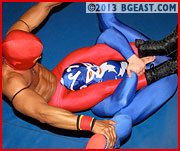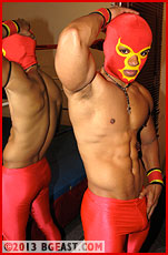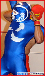 Cut to the BG East ring. Red Rocket is an equally magnificent sight to behold: sleek red tights, black boots, and a red mask that covers his entire head, with the traditional lucha trim (antifaz) in yellow, accentuating eyes, nose, and mouth. His torso is golden and sharply defined, as splendidly proportioned and as muscular as any comic-book hero's. He's fire and fury personified, coiled tight like a spring and ready to ignite. His bangin' body and beautiful butt would be right at home at a swim meet or on the cover of a Harlequin romance novel. Red Rocket prepares, stretching his lithe muscles when Blue Lightning wordlessly creeps into the ring and gives notice that the handsome hero in red is soon to bite the dust. Rocket looks undaunted. Then, all of a sudden, Lightning strikes!