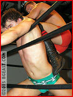 Well, now you can certainly see the sweat flying off both wrestlers' bodies as Hartley absolutely refuses to go down a second time, his own well-placed kicks and slams turning the tide again. When a bow and arrow submission ties them up at one fall each, both men know they need to pour on heaping helpings of pain and the punishment to come out on top. Before the final fall, one wrestler will be tied up, abused, hobbled, and finally humbled, left crumpled on the mat with a triumphant and sweat-soaked winner posing victorious over his fallen form. Will it be methodical, powerhouse pro studstar Lane or that budding heel who's been fighting to break through to the surface of 'former' babyface Austin Cooper?