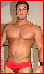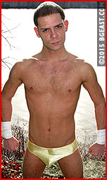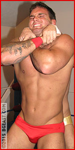 The first contest of this new series opens with meaty muscleman Chace LaChance, smooth as a bronze sea god, tan as salted caramel, striking poses in front of the mirror before his opponent's arrival. The fire-red briefs offset his dazzling pulchritude. Our mouths are already watering. Even with three memorable matches chalked up at BGE, Tim Messina is an unlikely opponent for the hard and handsome bodybuilder. Tim previously took some hard licks against Morgan Cruise, Jake Lowe, and Charlie Panther, but given the verve of his ring entrance you'd think he expects to wipe the floor with Chace's butt. (Stranger things have happened!) He leaps into the squared circle, the front pouch of his pale yellow trunks bobbing up and down.