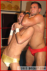 Straightaway Chace shoves him to his ass. Unruffled, Tim rebounds with a flying dropkick to the big man's chest, a jab to the hard tortoise-shell gut, and a swift forearm blow to the jaw. LaChance is staggered but nowhere near down and out. He swings Tim into the ropes. Tim bounces back and monkey-flips Chace to the corner. He seizes the muscle god against the corner ropes and twice smacks the side of his head with his elbow. He attempts to whip the guy to the opposite corner, but instead Chace propels him headfirst to the turnbuckle, then swoops in behind with a rear naked choke. Tim's birdlike shoulders slap into Chace's massive pecs as the little guy kicks and grimaces, trying to escape. Chace keeps him clear of the ropes, hoping to make short work of the feisty pipsqueak. After a long struggle Tim succeeds in escaping, cracking the base of his skull to Chace's front teeth, forcing the break.