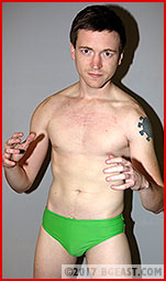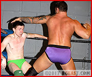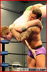 Strongly built and hugely popular Kelly King is the fighting man's fighter. He doesn't talk bullshit. He gets in the ring and takes care of business, a Stand Your Ground and Beat Him Up kind of guy. BG East's fresh recruit Cap Landon is all enthusiasm and high energy, not a lot of muscle, not a lot of ring experience, and pale as alabaster compared to his bronzed god opponent. "I'm real serious," he announces first thing upon bounding into the squared circle. Maybe he realizes there might be some doubts about this point, particularly among BGE fans who missed his rousing come-hell-or-high-water debut in Ring Rookies 5. Kelly is unimpressed, but he's not about to let his guard down around this guy. He's familiar enough with the BG East terrain to know that up here small packages sometimes hold big surprises.