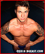 Blayze looks magnificent as he enters the BG East ring, bulgy in every which way, jaw set and brows knit, determined to fulfill a long-held dream. The chevron between his pecs and upper abs already glisten with a bit of sweat. The beefy stud poses in front of the mirror, his chest and shoulders as solid and sun-reddened as an Arizona rock formation. Seconds later, Jonny makes his entrance, hairy chested and at ease in tiger-print trunks that highlight his treasure trail and powerful thighs. Not skipping a beat, he walks right into his opponent, who's a head taller than he is, and glares up into his eyes. "Well," he says with a self-deprecating chuckle, "the Boss didn't say I'd be up against THIS today." The two pose side by side. Even Jonny recognizes the significant difference in their physiques. Trent proposes a test of strength. "Dude, you're a giant, you're a monster," Jonny replies. "Why in hell would I want to do a test of strength ...." (He pensively scratches his chin.) "You know, that would almost be as stupid as your stopping one of my amateur wrestling takedowns."