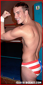 Young Cameron Matthews is going for the all-American boy-next-door look, suited up in skimpy stars and stripes briefs. At this point in Cameron's career, the rising New England indy pro star was well seasoned, but still pink and rare in the middle. He was about halfway through his evolution from post-pubescent skinny kid to muscle-draped beefcake. He knew just enough pro wrestling to be dangerous, but more to himself than his opponents, really. But nobody ever complained about Cameron's win-loss record once they got a look at his ample bubble butt so perfectly on display in his flag waving trunks.