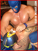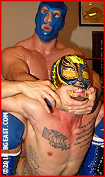 The masked men have few words for each other. They circle slowly, sizing each other up. Green Envy initiates contact, slipping behind his opponent and buckling up the guy's arms in a full nelson hold. Titanium Blue feigns helplessness, almost mocking his opponent, and then muscles loose and reverses as if not even trying. Green Envy's moans are far more convincing. He thrashes and panics like an animal caught in a snare. Yet his lean body is strong, sleek as a greyhound's, and after a lengthy struggle it breaks free and swings around to lock Titanium Blue in a rear choke hold. He's got a firm grip, but Blue backs to the turnbuckle, knocking the wind out of him and breaking loose. Titanium Blue proceeds to whip Green Envy from corner to corner, plying the man's abs and ribs with audible punches.
