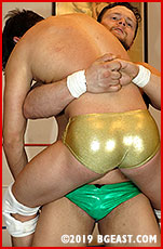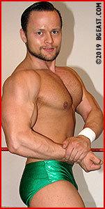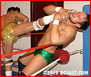 Baer wins the battle, but the war is far from over. Lonza's craftiness commands the final two-thirds of the match. Rather than concentrating on the arms as before, Luke mounts an offense against Gunner's whole body, head to toe. Though he makes a big show of honoring the rules of fair play, namely by limiting his more vicious assaults to a five-count (which, with no actual ref in sight, he renders at a snail's pace), this wolf in sheep's clothing is attempting to destroy his big opponent utterly. Later, when he rakes the top rope with Baer's nose and mouth, he exclaims, all innocence, "Am I breaking the rules? Oh no." Gunner suffers Lonza's viciousness and contempt splendidly, but as Luke piles torment atop torment, it looks less likely that the strongman can regain his earlier advantage and give this pretty punk the comeuppance he so richly deserves. And yet anything is possible at BG East, though seldom does virtue triumph here when the force of evil is as tasty-looking as Luke Lonza.