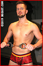 When the pair finally enter the arena, it's not as two opponents on equal footing, but as a captive and his captor! Carson staggers towards the ring, handcuffed and blindfolded, shoved along by a savagely smiling Kayden. With half the fight beaten out of him already, Carson offers little resistance as his "lesson" begins. Kayden takes his time removing the rookie's restraints, the heel's hands sliding seductively along that long, lean torso, and Carson can't help but start moaning. But he's soon groaning in pain as Kayden drags him to the mat and twists him into hold after hold, each one offering Keller a new angle from which to explore Carson's toned figure.