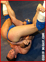 Jonny throws up a thick bicep flex as his powerful legs scissor tightly about Mr. E's skull.