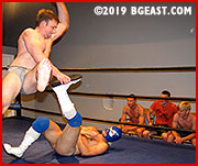 A beefy, buffwd Jonny drags a bound Mr. E from the ropes with a pull of the trunks for a gutbash.