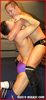 Dominant Ty in his heel black trunks flexes his muscles as he puts on a clinic of pleasurable painful holds on Carson, working on his resistance, working on his arousal, working on his masculinity. Carson's trunks grow even tighter as Ty controls the young stud's body, bending him, twisting him and displaying the body Ty can't seem to keep his hands or lips from touching, stroking, controlling. Carson's cries of pain are primal, instinctual, his own arousal surpassing his own fantasies of how he imagined this to go - it's even better, more sensual and amazing than he ever dared dream.