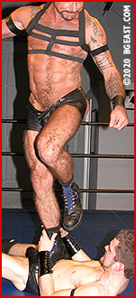 Kayden's balls become the prime target. Just like the BBW taught many a Dark Knight in Wrestleshack 5, that's the way you control a man. His poor ballsack gets yanked from front and back, stepped on, and then almost ripped away. But the goal is not to destroy them, but to use them to make Kayden submit, and submit, and submit until his mind is rewired to acknowledge Ray with the proper words. "Sir, I'm your SLAVE!"