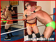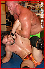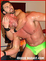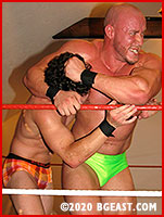 The first third of this match is, amazingly, give and take, with Zach equaling Brute in pugnacity. Zach more than makes up for the size and weight difference by using his agility and speed to offset Brute's thick muscle. A feisty Zach refuses to cave in to either Brute's might or his own self-doubts, clearly in the spirit of other seemingly inexhaustible brawlers like Jonny Firestorm, Paul Hudson, and Kid Karisma. A speedy string of reversals builds suspense, and the match swells into a grunt-and-groan classic. Brute uses his body to bash, squash, and wring out his opponent. He also has the muscle to withstand almost anything Zach can throw at him. Zach counters with two highly effective techniques: hurling his whole body at Brute like a torpedo and choking the big dude out or, at the very least, constricting the windpipe to weaken the strongman.