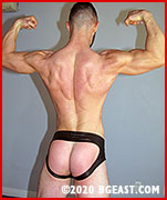 Stripped down to just an ass-baring jock, Skyler shows you true power with a double bicep flex