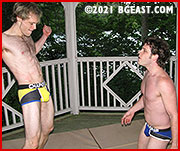 This is personal, and not just because of their titanic defeat as a tag team, but because of countless petty rivalries and family dramas that have been building their entire lives. Hair gets pulled out by the fistful. Wet willies and noogies settle scores that have been tallying for 20 years. They trade gut punches, which seems unwise when one of these muscled lightweights sports the Best Abs of 2020. But it's the low blows that signal that victory here in the gazebo is less about their future as a tag team than it is about unloading old baggage that they've been carrying around since they were kids out back behind Kenny's barn, testing their bodies and their egos against the one person they thought they could count on to stand by them to the bitter end. If Kenny and Rocky can't settle this feud and patch things up, swooning fans are going to be bitterly disappointed to never see this stunningly beautiful, light-haired, babyface tag team in the same corner again, and Thanksgiving dinners with the Sparks/Starr family are going to be seriously awkward!