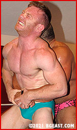 Karisma thrashes and grunts like a cat squashed under a fallen tree limb. Never short of resources, though, Karisma needles Guido with his knuckles, forcing the bigger wrestler to draw back. Guido recovers quickly, bracing Kid K in a chin lock, then rolls him over so fans can have an unobstructed look at Karisma's taut, salmon-pink pecs and abs. The torso is gorgeous as always, but his face is all grimacing rage. He breaks free only to find himself still caught between Guido's gorilla thighs. We have never seen the Kid in this much torment, helpless yet with not an iota of acquiescence. When Karisma's right hand clasps Guido's face, Guido slaps it to the mat, growling, "Get the fuck outa here before I rip that arm off!" "I give, I give," Karisma sobs â?? words even back then we almost never expected to hear from his lips.