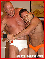 The exposed abs of a standing ab stretch finally lures Damien to get inside the ring and be part of the merciless beating, laying his own fists into those rock hard gut muscles until Chace is nearly passed out. But the double-teaming suddenly comes to a halt when Damien goes to 'pin' his almost inanimate victim for a 3-count. Brute drags the rich snob by the hair, expecting his dues for a job superbly done. "Oh, right" he says reaching into his trunks for a bill. It's not the bill Brute was looking for - Damien has dismissed Brute as cheap labor! The irked but heretofore polite bodybuilder body-double turns instantly into a one-man tag team, ready to make some one, or better yet, BOTH, these athletic wannabes pay - one way or another!