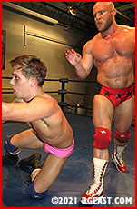 Brute focuses most of his attention now on Eliot's back, as though wrecking this stud's core from every angle is giving him the same twisted pleasure as he inflicts stomps and twists his victim's spine. On the ropes, with Eliot's bulge on display, or in a wrecking rack, the backbreaking focus is punctuated by temptations to just choke out his prey once and for all.