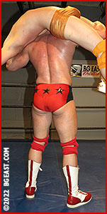 Kirk is stretching and getting warmed up in the ring when his massive opponent climbs up on the ring apron: Brute Baynard, who with incredulous surprise on his face, simply asks, "Dude, what are you doing here?" with a shake of his disbelieving head. "Just looking for a competitive match," Donahue replies as the aptly named Brute parts the ropes to make way for his massively muscular physique in his patented pre-slaughter ring entrance. Poor Kirk. Nothing could have prepared him for this massive monster whose bloodlust won't be satisfied until his opponent is a twitching pile of tenderized muscle in the center of the ring.