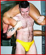Brawlerboy has a thing for smooth, young muscle. With nice abs and skin like silk, Max more than delivers on Brawlerboy's fantasy. He knows Brawlerboy wants him, quickly climbing on top of the hairy-chested hunk and thrusting his basket forward while he flexes in a blatant tease. That's like throwing raw meat to a hungry bear! Brawlerboy lets Max wrap his soccer player thighs around his head, but he's obviously just toying with the humpy lad. A test of muscle strength ensues and, before Max realizes what happening, the bigger brawny Brawlerboy scoops him up and throws the prettyboy down onto the hotel mattresses. Lots of cocky schoolboy pins, scissors and sleepers. And the way Max moans as Brawlerboy works him over, it's a wonder the concierge didn't come running!