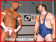 Jonny strides up to the ring in a navy-blue singlet, a travel pack on his shoulder. Already at ringside, Gabe cannot contain his joy at seeing his longtime wrestling idol. Jonny nods his head and commends Gabe's upper body muscle. "You have quite the reputation," he says. Modestly, Gabe says, "I've been building up to it." Jonny then gestures towards the bulge up front on Steel's salmon-pink trunks and asks, "I wonder if you live up to it down there." Gabe grins broadly, "It's unbreakable, man." Steel is his name, and steel is his invincibility. Not breaking eye contact, Firestorm replies, "I'll put that into the test."