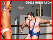 Jonny looms dominantly over a grovelling opponent and drags his trunks up in a wedgie