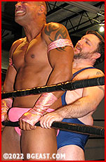 Jonny traps his bigger foe and yanks the middle rope up into his massive pink bulge