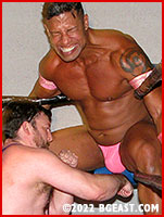 The room turns suddenly dank as a medieval torture chamber. It is almost funny that as big a Firestorm fan as Gabe is, or was, he still couldn't see this one coming. Right now, he has trouble seeing anything. Everything is a throbbing blur. Jonny grabs a wrist and ankle and pulls, digging his boot into Steel's spine. He shifts position, pulling apart Gabe's thighs and slapping the now throbbing bulge in his opponent's glimmering trunks. Then he applies the iron claw to Steel's thick pecs. At this point, Gabe's usually handsome face is all veins and sweat. Firestorm launches a series of torments, amazingly bending Gabe's massive, thick body into pipe-cleaner shapes. Gabe is totally, totally helpless in Jonny's clutches.