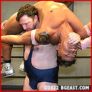 Gabe's big muscled body bends perilously backwards in a ball-clawing backbreaker variation
