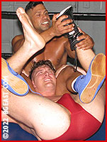 "What you doing?" Gabe asks, a friendly smile on his handsome face as he climbs through the ropes, checking out this hot new heel the Boss has been telling him about. Drew replies that he's just getting warmed up before the match - and then Gabe sees something he really likes even more than his opponent's body: Drew's boots! They are beauties, too - black leather, low rise on the calf, clearly a custom made product, which Drew confirms once Gabe starts admiring them. "Pretty slick boots, man," Gabe says, the muscles in his upper torso flexing - similar to a rattlesnake's rattle for those who've been where Drew is right now. "I want them." Whatever Drew was expecting to encounter in the Arena, a conversation about his boots wasn't it. A little confused but not wanting to be 'that asshole new guy,' he offers to set Gabe up with his bootmaker...but Gabe is fixated on this particular pair, and Gabe is used to taking what he wants. A blond muscleboy sure as hell isn't going to stand in his way, and he clamps a nasty headlock on the unsuspecting blond stud. "What the fuck?" Drew gasps out as the steely biceps flex and the grip on his skull tightens. As he tries to find a way out of his predicament, to counter this strange dude with a fetish for his boots, Gabe is comparing his own foot to Drew's. "We're the same size, man, I'm taking these fine boots."