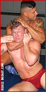 "Are you kidding me?" is written all over Drew's reddened face as Gabe puts him through some impressive mat work, with the blond not ever getting a chance to breathe or center himself, or mount any defense - let alone offense. Gabe transitions into an impressive series of back torture holds, as Drew's face and skin turns a darker and deeper red, as the sweat begins to roll down from his hairline, as his breathing becomes more labored as the throbbing aches and pains from almost everywhere force out any thought of going on the offensive - all he can think is survival!