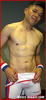 Their sexy singlets reveal the muscles and bulges of these two similarly sized opponents as they begin wrestling in solid back-and-forth action. Shooting sharp shots to Sunny's abs, Forrest exults, "Too much for you, Sunny?" Sunny just smirks, "You got nothin." With his head caught in Forrest's powerful leg scissors, Sunny takes a couple more tough ab shots. "Feel free to give up whenever you're ready." Sunny holds on soaking up the pain, but is finally forced to yell "Alright! I give!" "Yeah, that's what I thought. You don't need this to wrestle in!" Forrest now confidently strips Sunny of his singlet, revealing a hot pink jockstrap on this hot rookie jock.