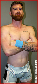 "...Perchance to dream." Forrest opens his eyes again, unsure what has happened. He sees and feels Sunny sitting on his chest and flexing. Quickly he uses a burst of fresh strength to push Sunny off and take control. "You're not so tough. You're not tough at all, Sunny." Forrest is not happy about being put out and revenges himself on the jock-clad rookie with ball slaps, ab punishment, and a brutal camel clutch, forcing Sunny to tap in agony. "Not so tough now, huh? Who's in charge now? Who's in charge!?" "You are!" Sunny cries out, looking at Forrest's sweaty, bulging muscles as he feels his own energy - to control Forrest or even his own passion - slip away. From punishing holds to sexy control, Forrest repeatedly forces Sunny to say that Forrest is in charge. Sunny submits to a body scissors, but Forrest isn't satisfied with words and makes him tap on the mat. "Feel me up like the jobber you are," Forrest commands. Sunny is forced to worship Forrest's muscles, defeated and admiring the heel power and ruddy sweaty muscles in his face. "Who's the best?" Forrest enjoys. "You are." "Who am I?" "Forrest. Forrest Taylor." Forrest presses his advantage into steamy territory. Is this a dream, because it's a good one! Yet just as suddenly as this raunchy scene begins, Forrest blinks and it's Sunny now entering the matroom as he lies on the mat. "Hey buddy. I just wanted to check up on you." What happened? "Did I win?" "No, but you've been out for 30 minutes. But you're still 'Jobber of the Year' at least." "Screw you," says Forrest as the powerful images of his glorious finale as a dominant heel taking pleasure while taunting, punishing and controlling his jobber fade from his mind. But not the minds of his fans! No matter which ending you prefer, or whether all this was one long dream, these raunchy fighters show what they are capable of on the BGEast mats.